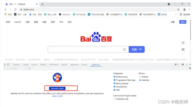 先访问需要评估的网站,比如 http://www.baidu.com,然后点击灯塔按钮,选择 generate report 即可