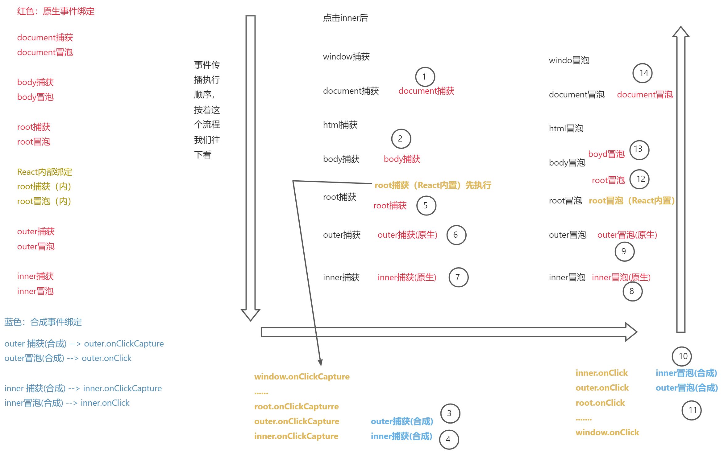 document 捕获 > body 捕获 > react 组件根节点 捕获(合成) > root 捕获 > inner 节点 捕获(合成)> inner 节点 冒泡 (原生)> inner 节点 冒泡 (合成) root 冒泡 > body 冒泡 > document 冒泡
